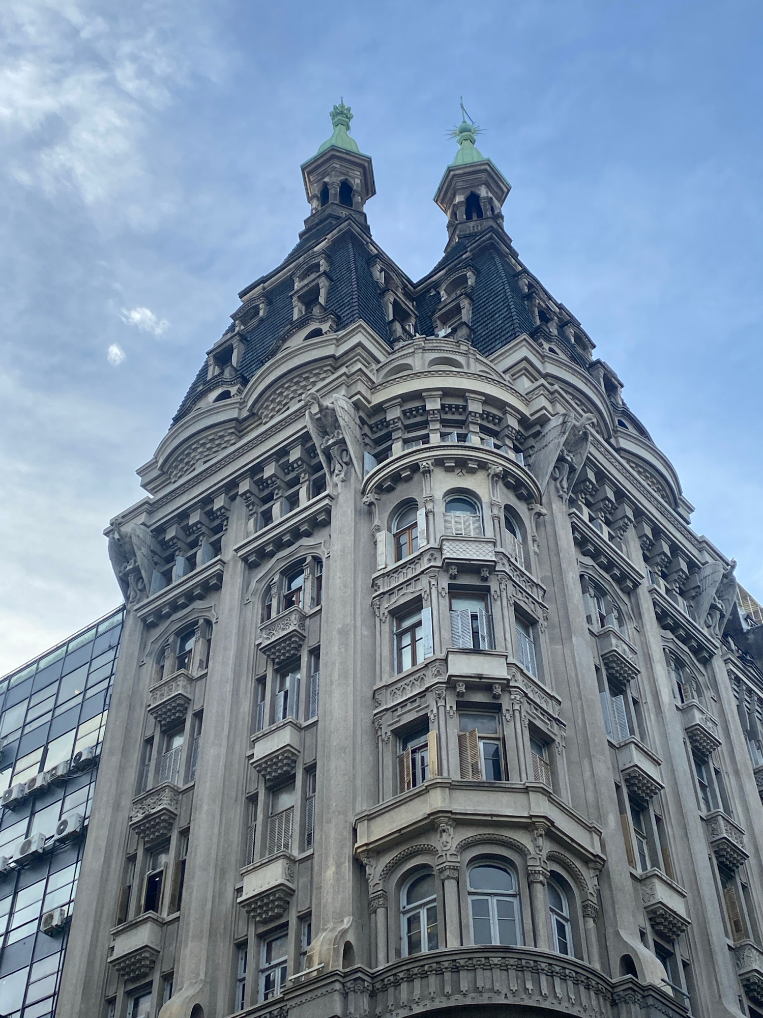 A low-angle shot presents the Palacio Barolo, located in Buenos Aires, Argentina. The architecture is a blend of Italian and Gothic styles, with twin towers capped by green spires, ornately decoratedβ¦read more