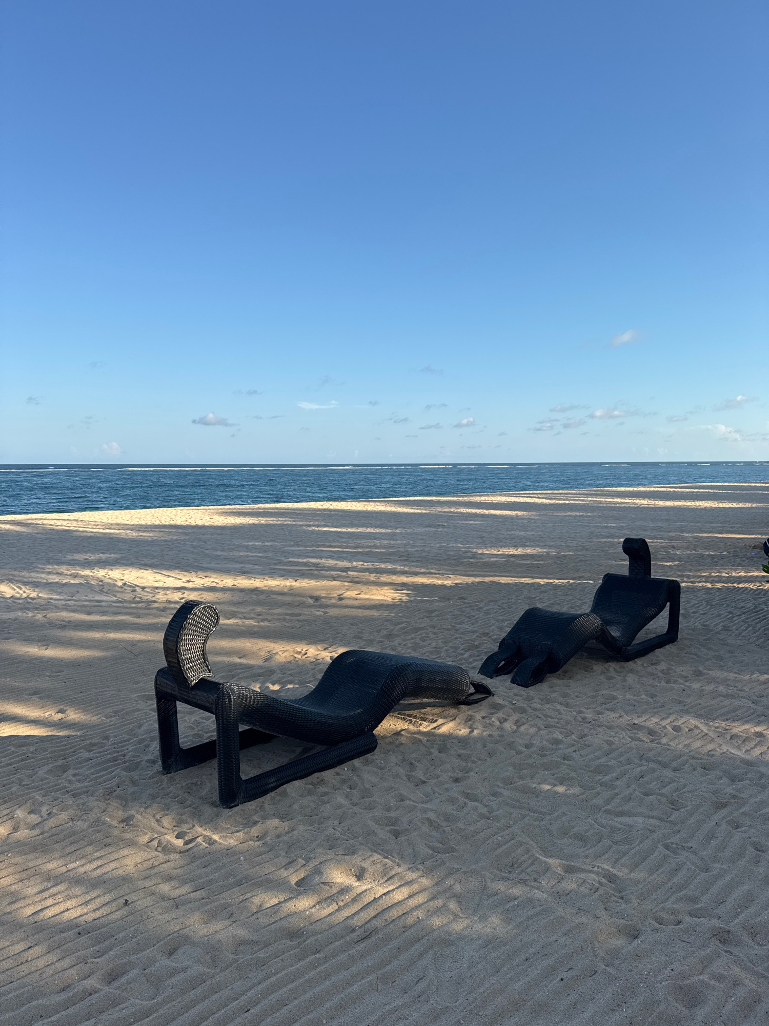 The image shows two black woven beach chairs resting on a sandy beach. The beach is located in the city of Unknown, Indonesia. The left side of the frame features the ocean and a clear blue sky with f…read more