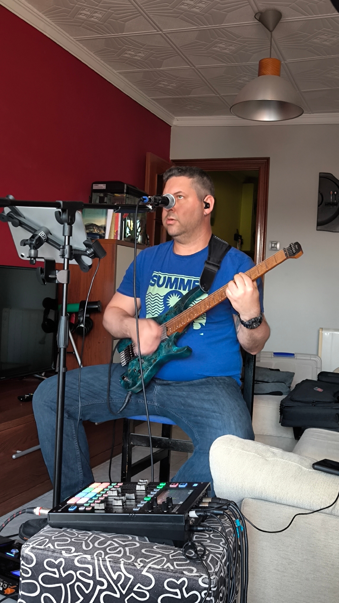 A man is playing an electric guitar while sitting in a room. He is wearing a blue t-shirt, jeans, and a watch. He has short, graying hair and is wearing earbuds. He is playing a blue electric guitar w…read more