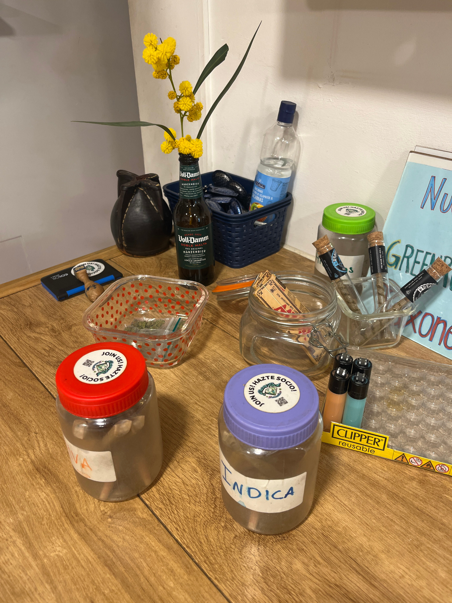 This image displays a collection of items arranged on a light wooden surface, likely a table or floor, next to a white wall. The scene suggests a personal, casual indoor setting. Prominent objects inβ¦read more