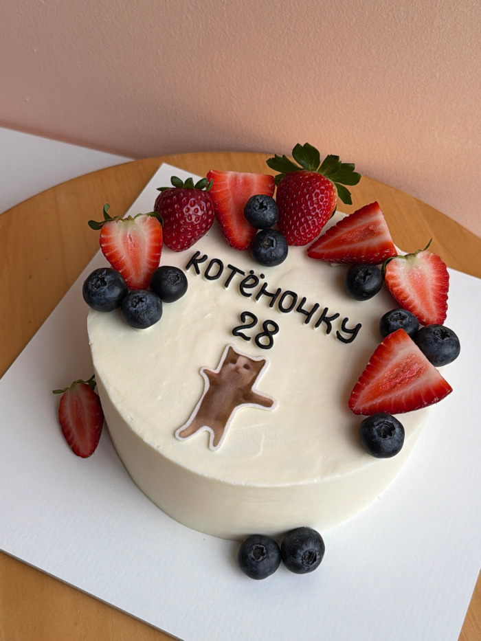 A white frosted cake is decorated with fresh strawberries and blueberries. Cut strawberry halves and whole blueberries are arranged around the top edge. In the center of the cake, black lettering spel…read more