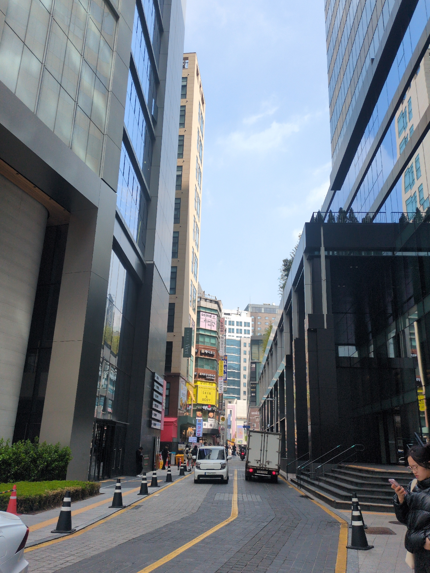 The image captures a street in Seoul, South Korea, framed by modern buildings. The left building features a reflective glass facade, while the right building is darker, with steps leading up to it. In…read more