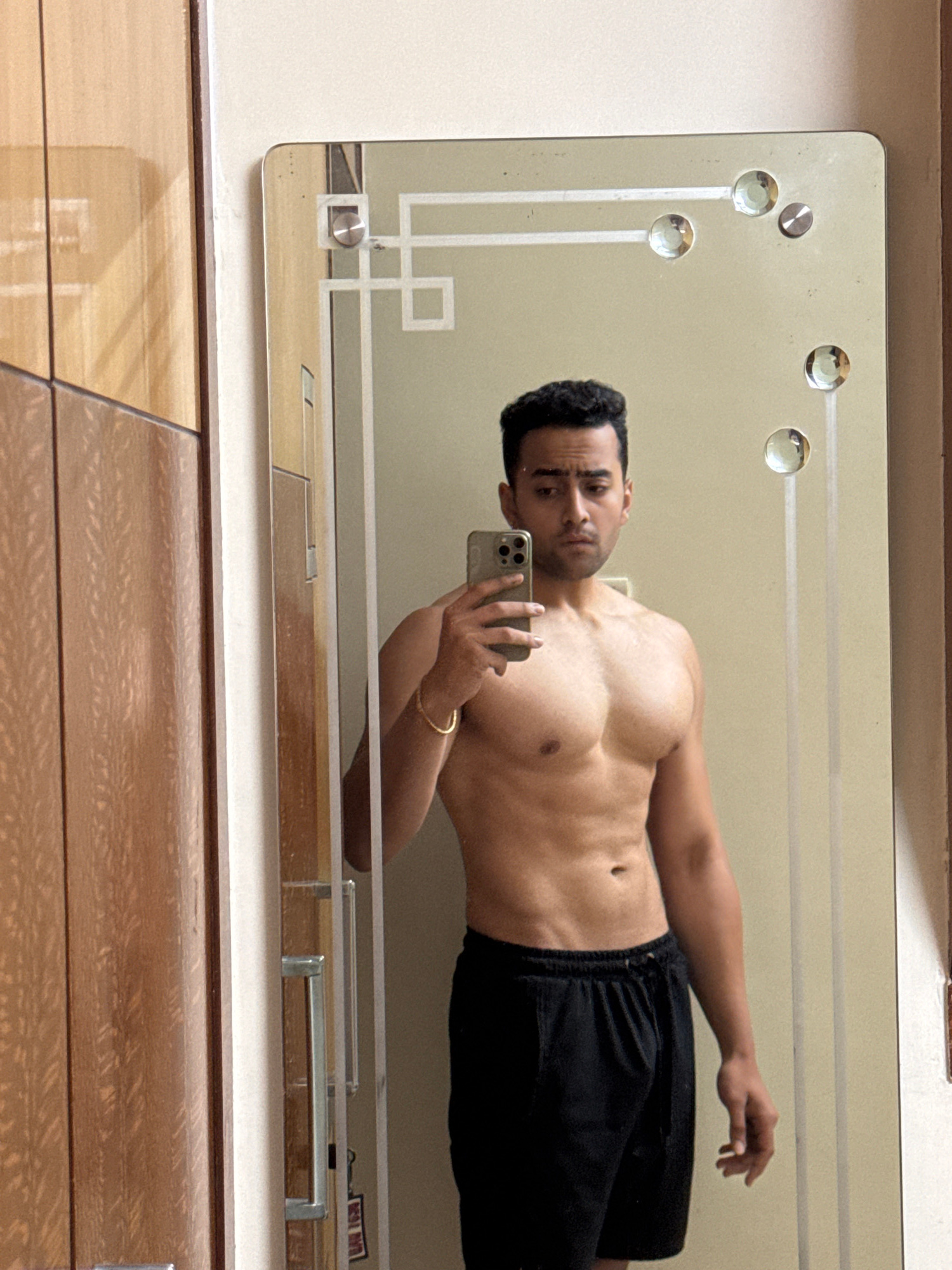 A shirtless man with dark hair and a serious expression is taking a selfie in a mirror. He is wearing black shorts and a gold bracelet on his left wrist. The mirror is mounted on a light-colored wall,…read more