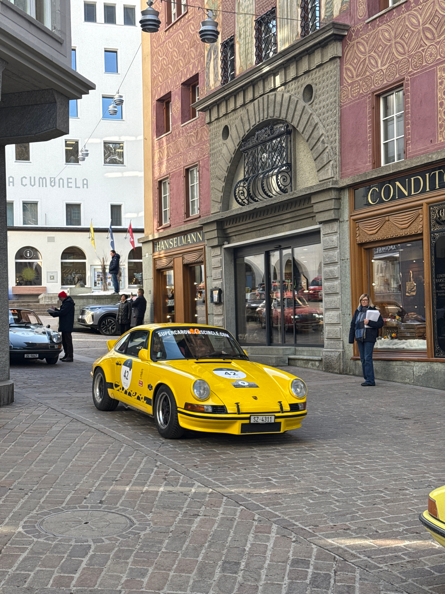 The scene depicts a street in Sankt Moritz, Switzerland, dominated by a bright yellow vintage Porsche 911, car number 42, centrally positioned on a cobblestone surface. This vehicle displays black num…read more