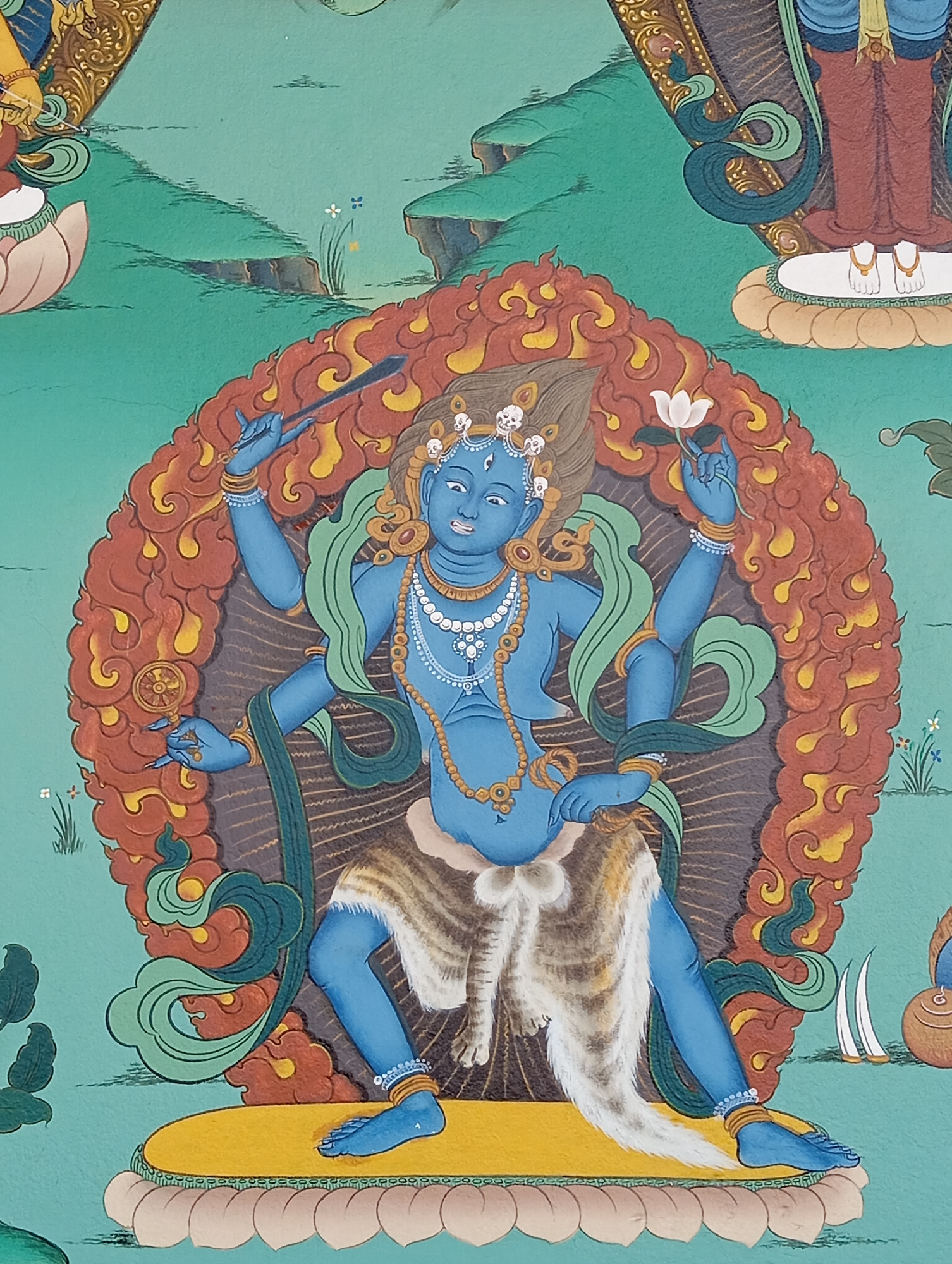 This is a detail of a painting depicting a blue-skinned, four-armed deity, possibly a Buddhist figure. The deity stands on a yellow lotus platform, positioned against a green backdrop with stylized laβ¦read more