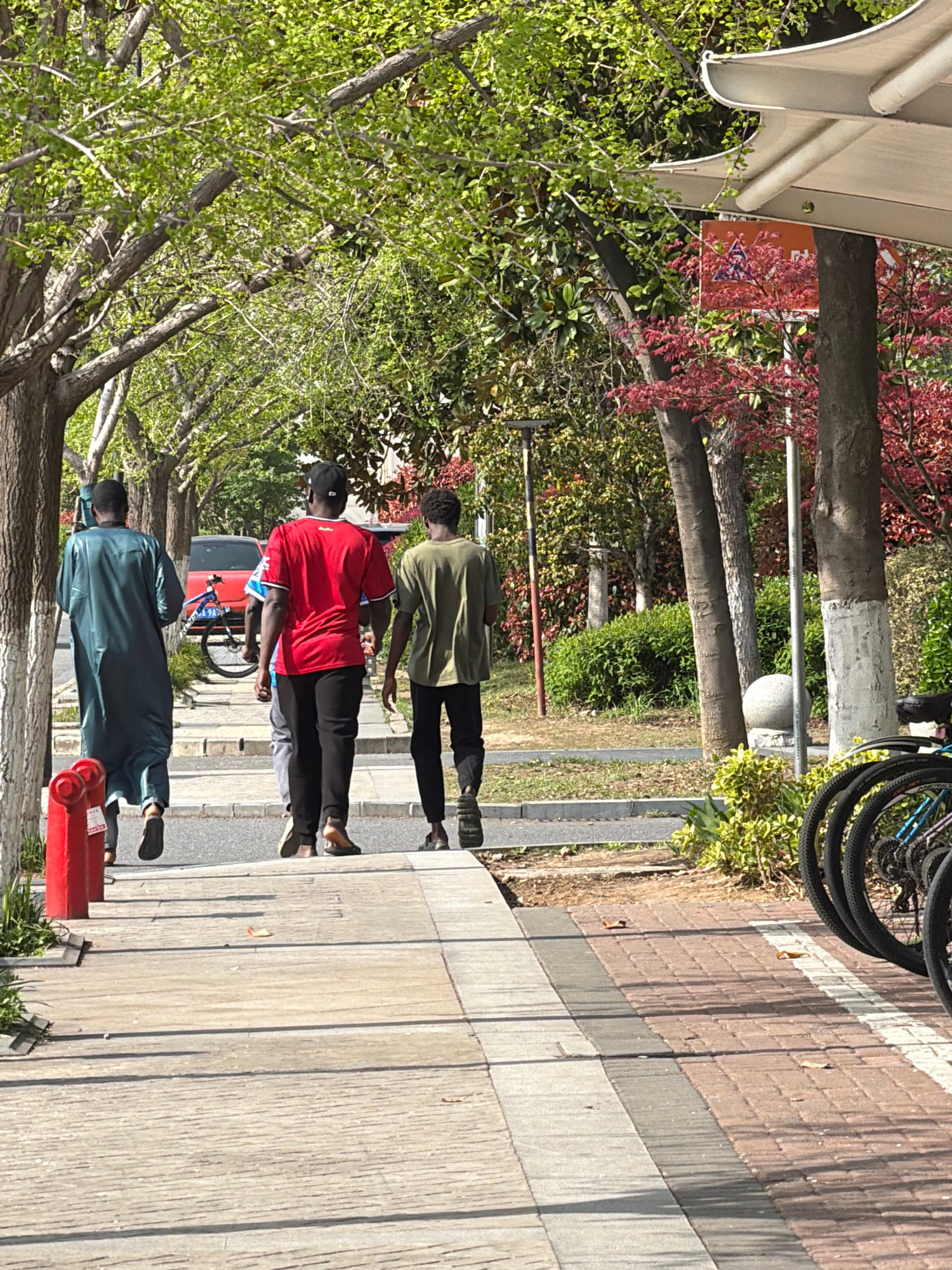 Three people stand on a sidewalk, partially obscured by trees. One wears a green-tinted robe and stands near a red fire hydrant. The second wears a red shirt and a baseball cap. The third wears a gree…read more
