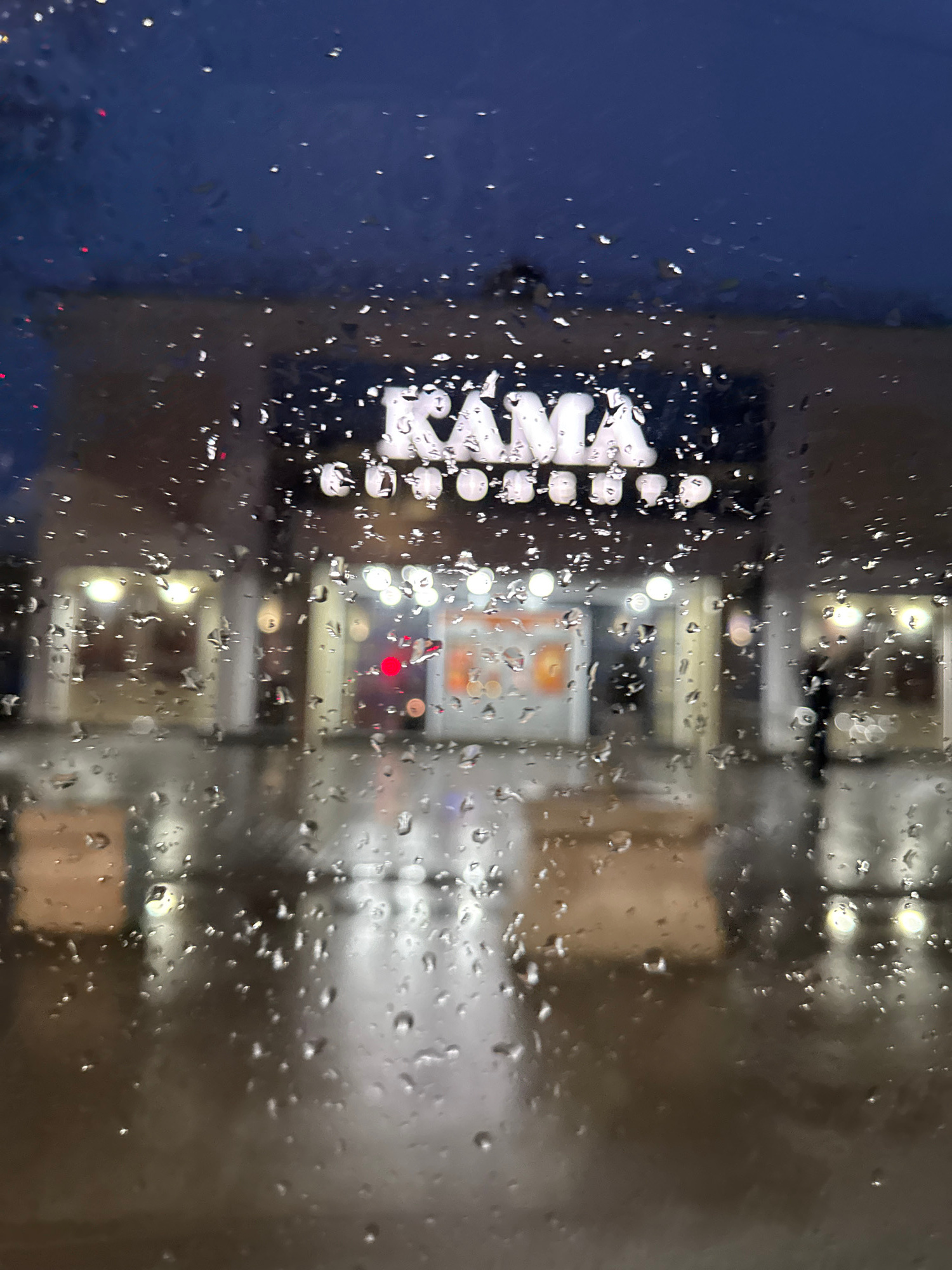 A wet window obscures the view of a building exterior in Chaikovsky, Russia. The blurred reflection shows a multi-story structure. A brightly lit sign reads "WAVE" vertically. Light posts, and a red lā¦read more