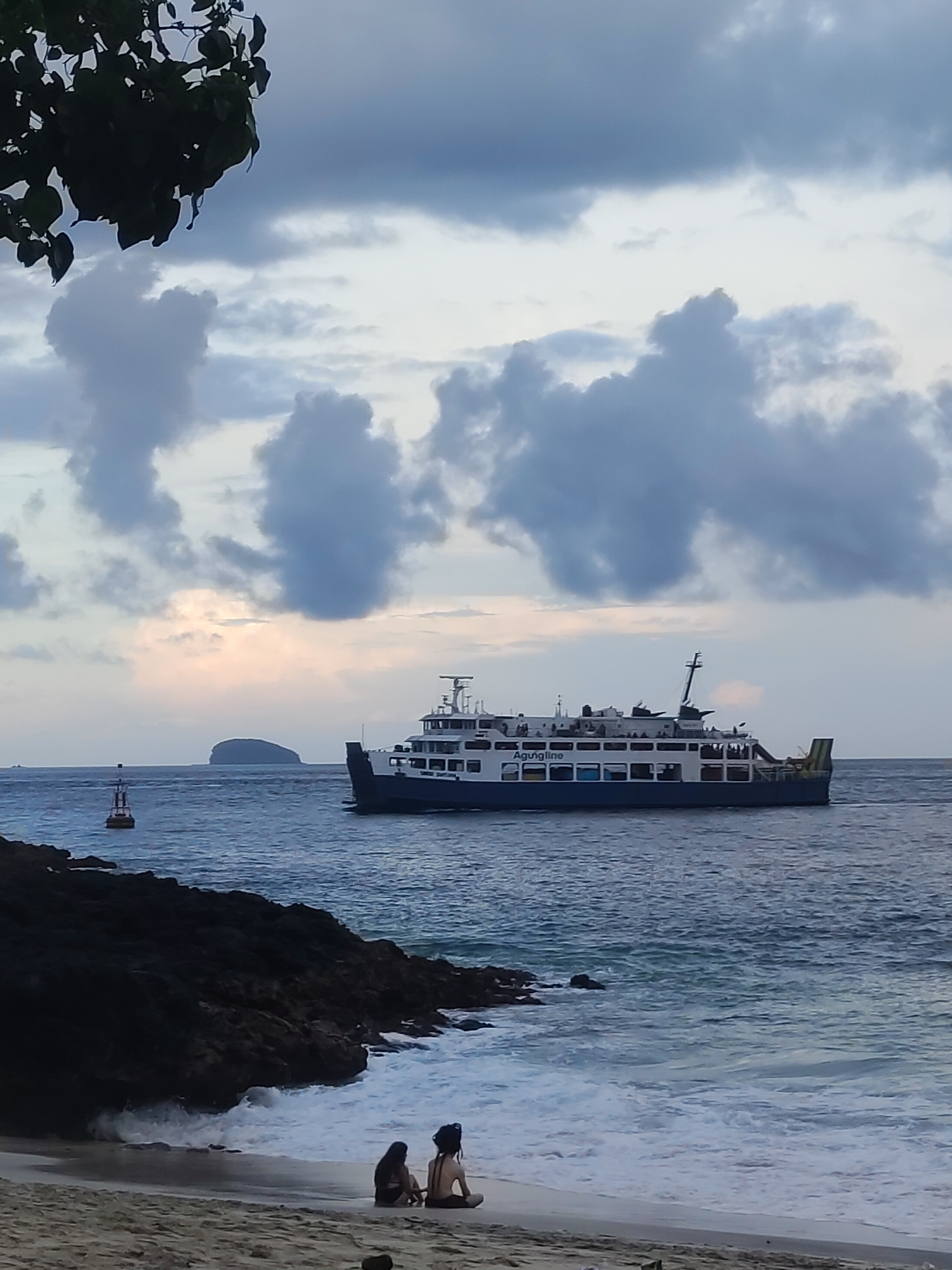 The image captures a coastal scene in Unknown, Unknown. In the foreground, two individuals are seated on a sandy beach near dark, rocky terrain where waves are breaking. A ferry with the name "Agungli…read more
