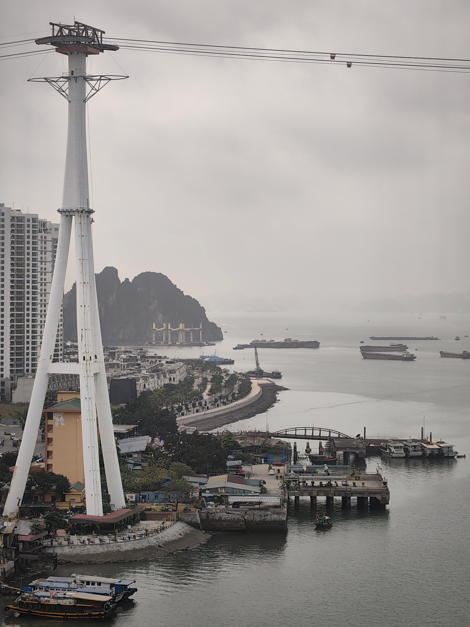 The scene captures an elevated view of Bai Chay Ward, Vietnam, during an overcast day. A prominent white cable car tower dominates the left foreground, with cables extending across the frame. Adjacent…read more
