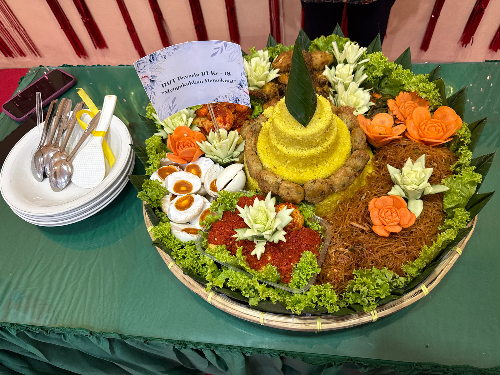 The image depicts a Tumpeng dish, a traditional Indonesian cone-shaped rice dish, displayed on a woven tray, on top of a green tablecloth. The Tumpeng is adorned with various side dishes and vegetable…read more