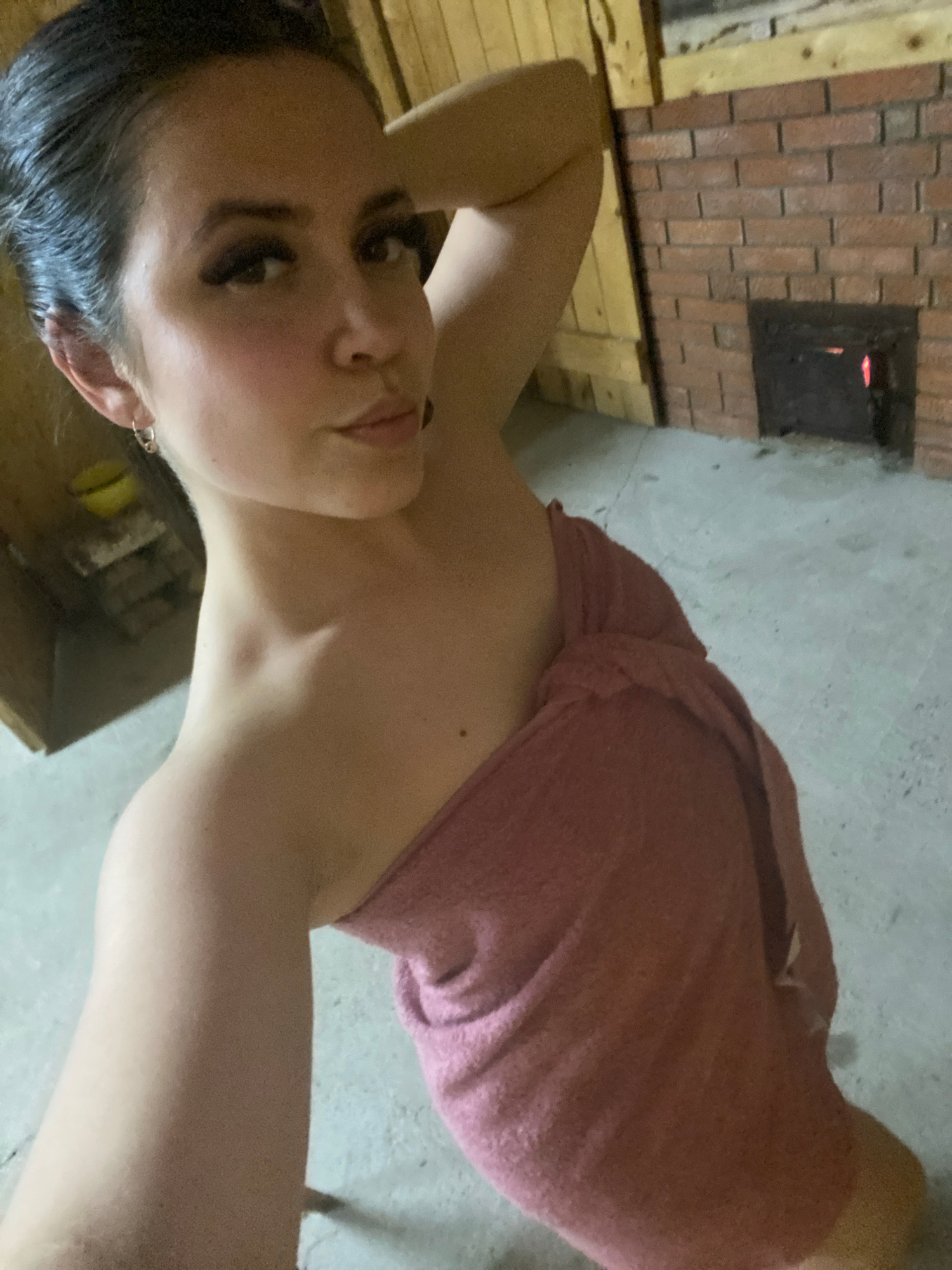 A woman wrapped in a pink towel is positioned in what appears to be a sauna or bathhouse. Behind her is a brick wall with a small firebox opening. Wooden planks line the wall below the bricks. The flo…read more