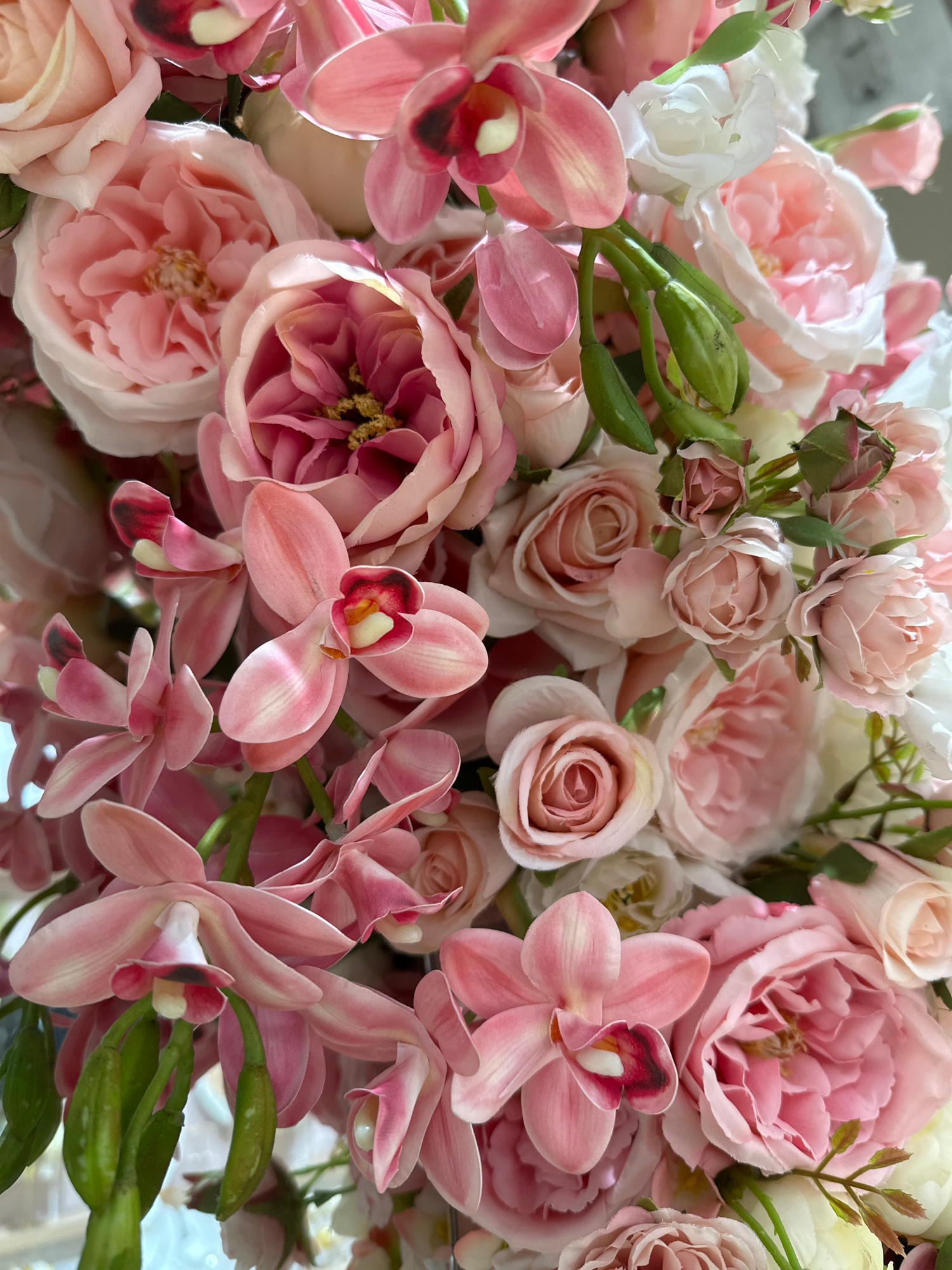 The image presents a vibrant, close-up view of a dense floral arrangement, rich in shades of pink, cream, and white. The composition is dominated by two main types of flowers: roses and orchids. Nume…read more