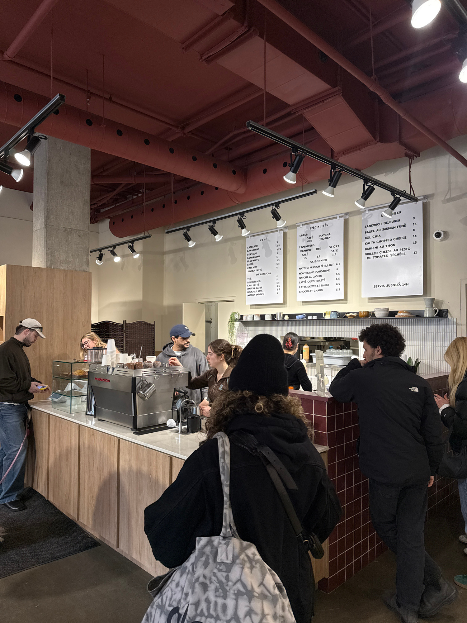 The image shows the interior of a busy café in Montreal, Canada. Patrons are queuing at a counter with a printed menu board displaying a variety of food and beverage options in French. The menu includ…read more