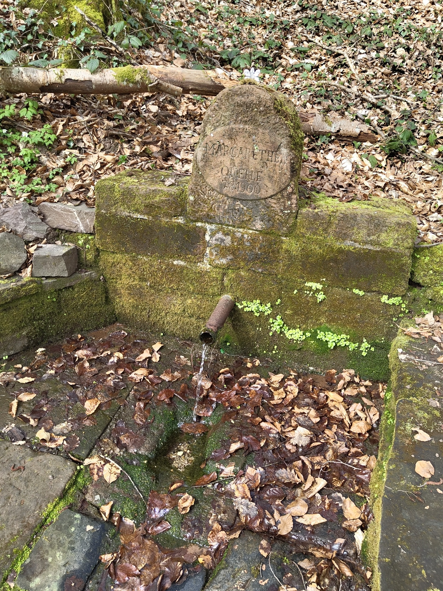 The image shows a moss-covered stone structure in a wooded area, possibly the location of a spring or fountain. A carved stone with the inscription "MARGARETHELLE 1890" is present on the left side of…read more