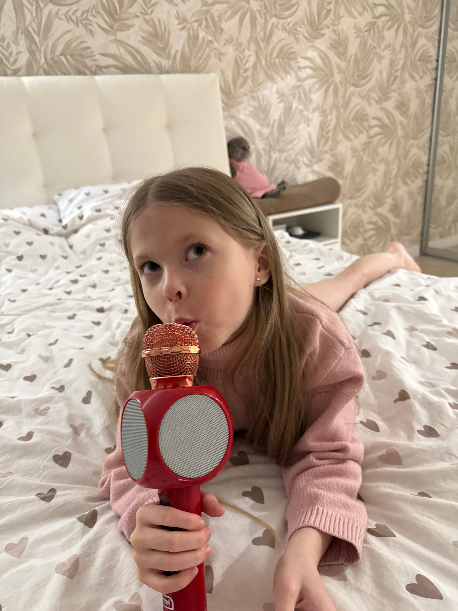 A young, light-skinned child with blonde hair lies on a white bedspread patterned with grey hearts. She is wearing a pink sweater. She is holding a red karaoke microphone close to her mouth. The headb…read more