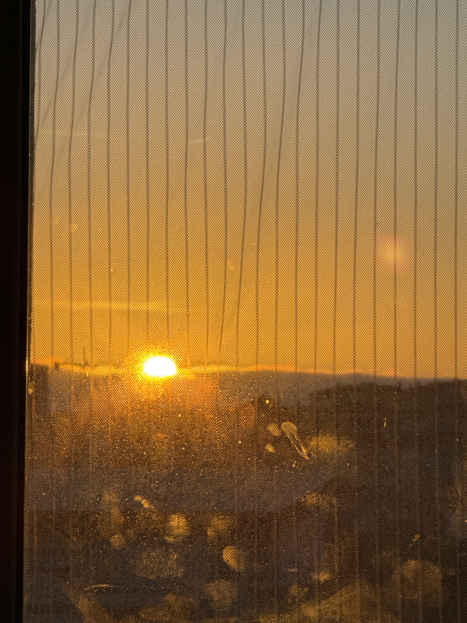The image shows a hazy view through a rear car window with embedded heating elements, likely during a sunset or sunrise. The view is divided into two sections: the left portion shows a diffuse goldenβ¦read more