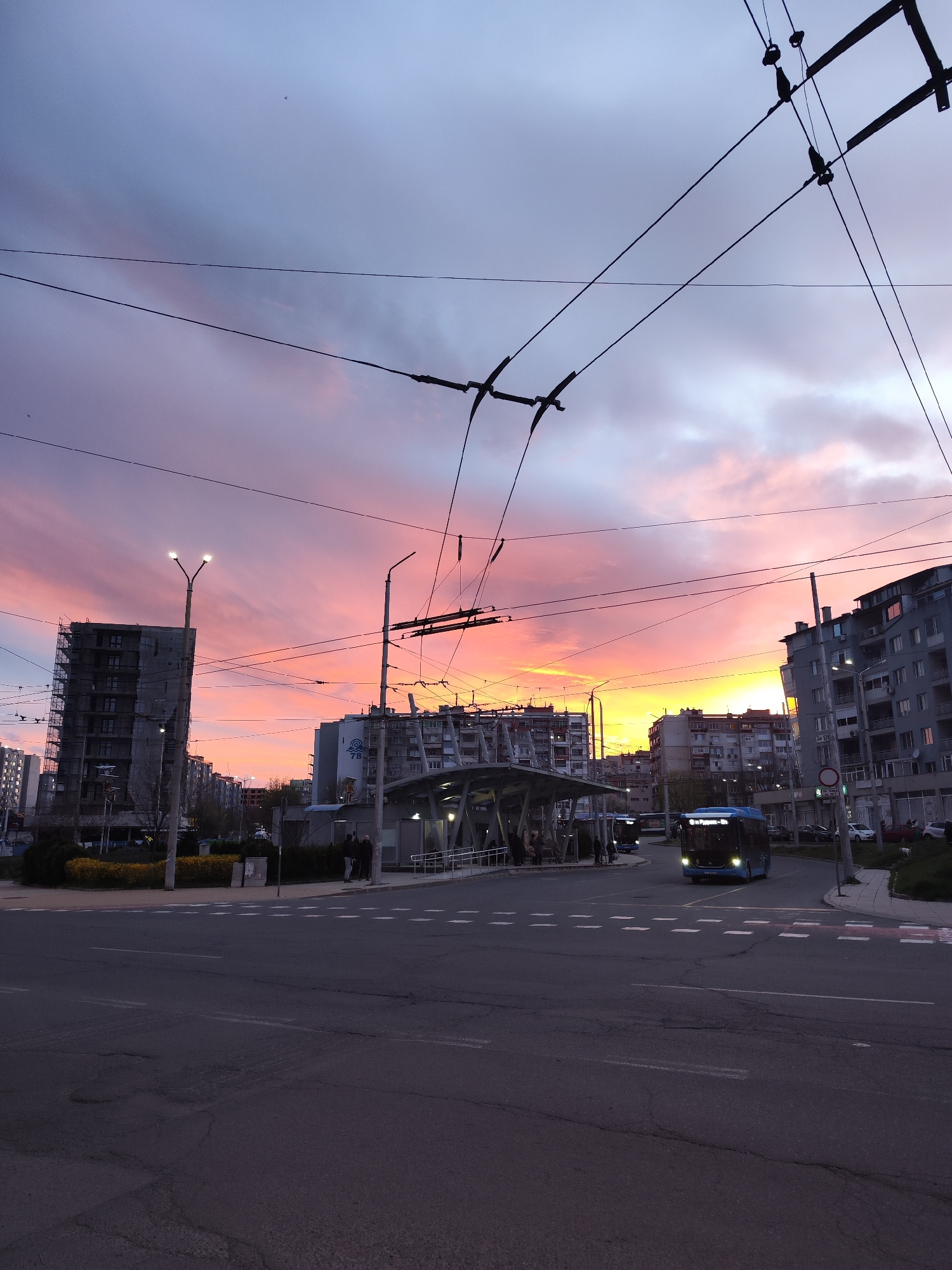 The image shows an urban scene in Burgas, Bulgaria, at twilight. The sky is a mix of colors, ranging from orange and yellow near the horizon to pink and purple higher up. Silhouetted buildings line th…read more