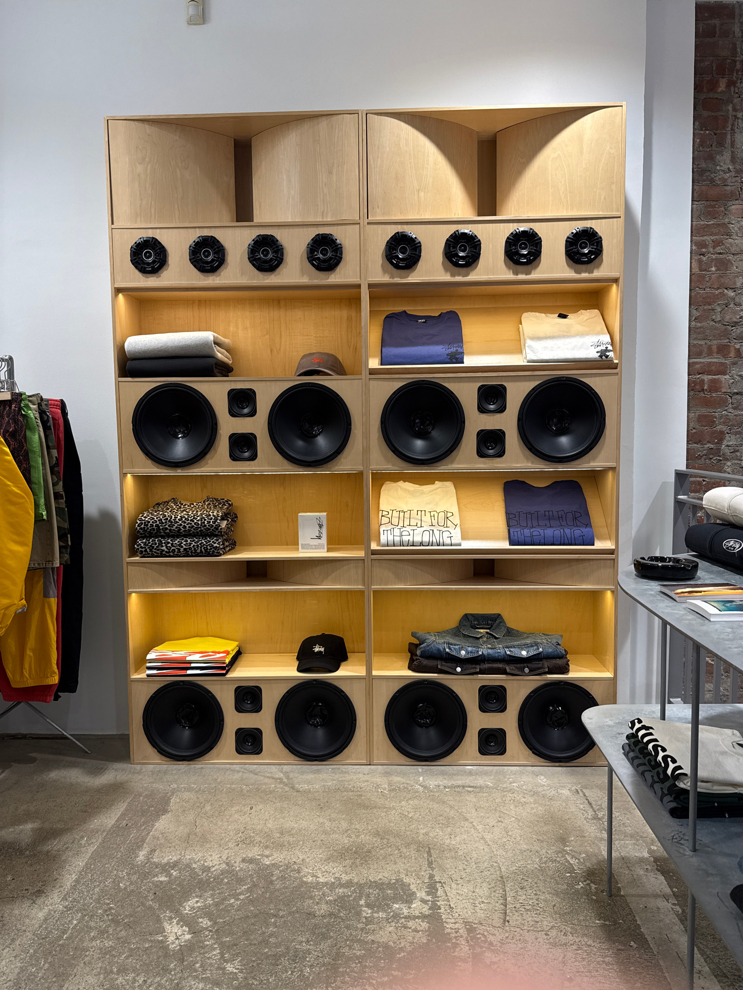 The image depicts the interior of a retail store located in the city of New York, United States of America. A large, custom-built display unit, fabricated from light-colored wood, occupies the centralβ¦read more