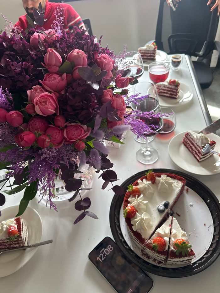 The image captures an indoor scene at an unspecified location in Zovuni, Armenia, centered around a white table set for a gathering. A prominent, elaborate floral arrangement, consisting primarily of…read more