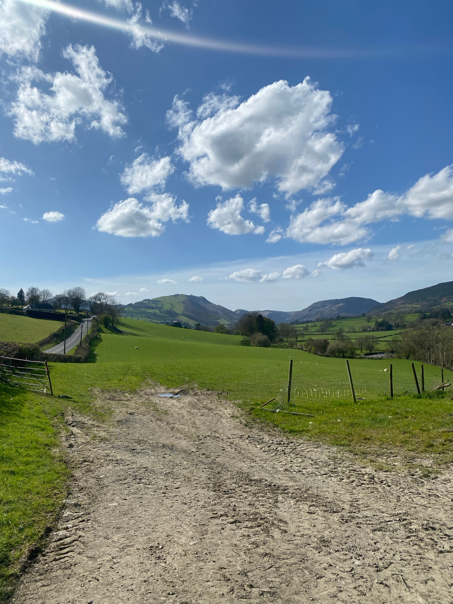 The image shows a rural landscape under a blue sky with scattered white clouds. A dirt path is visible in the foreground. Adjacent to the path is a green field, separated by a fence. Further into the…read more