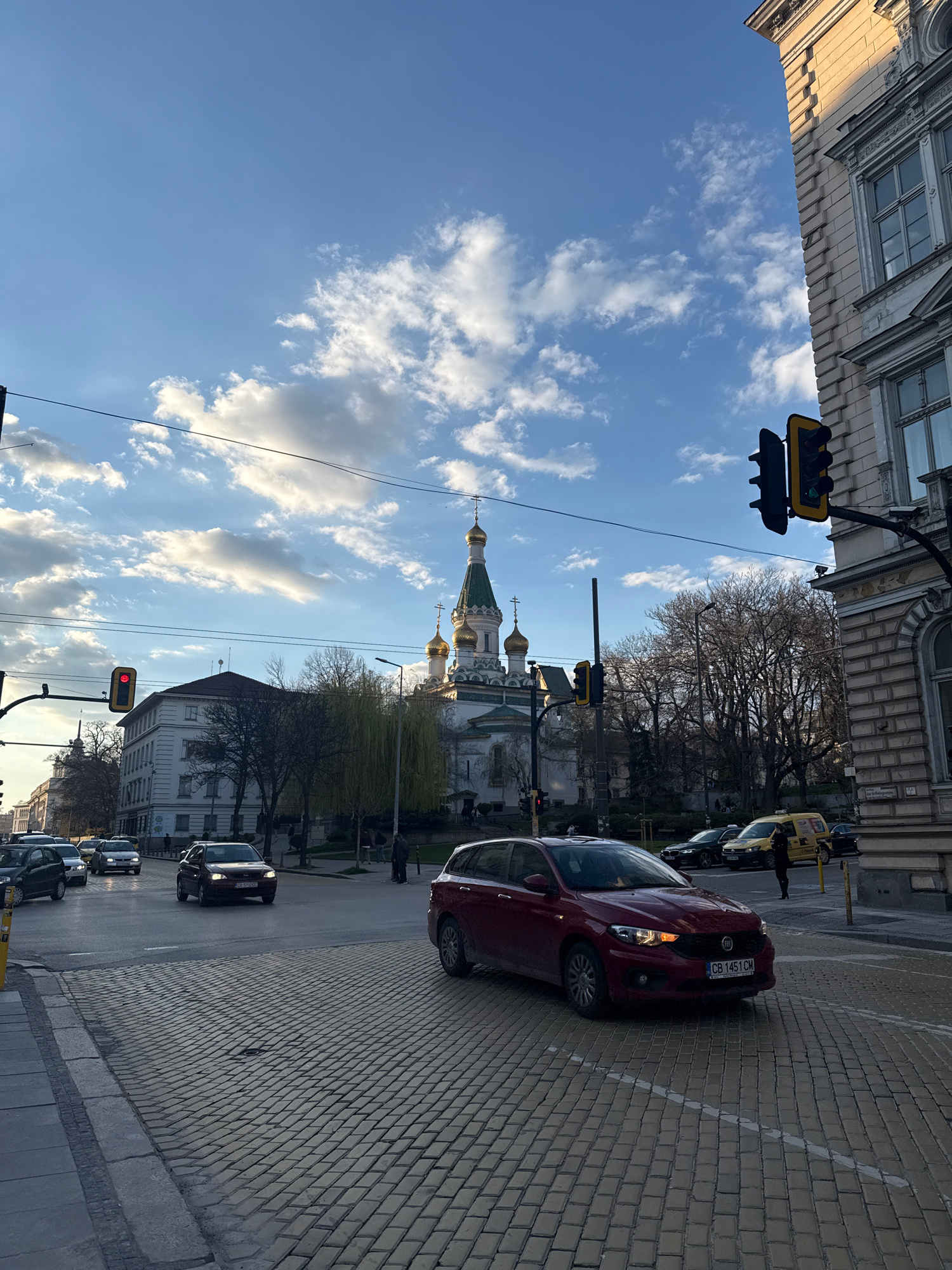 The image shows a street scene in Sofia, Bulgaria, featuring the St. Alexander Nevsky Cathedral in the background. The sky is blue with scattered clouds. A red car is parked on the cobblestone street…read more