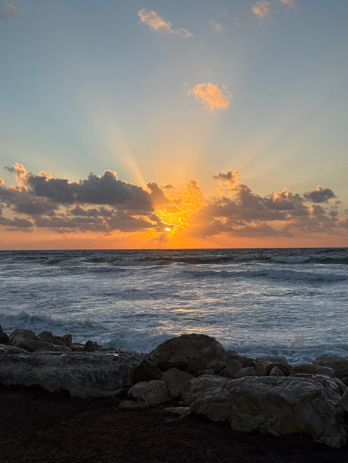 The image displays a coastal scene at sunset, likely along the Tel Aviv coastline in Israel. The sun is positioned low on the horizon, partially obscured by a band of dark, horizontally elongated clou…read more