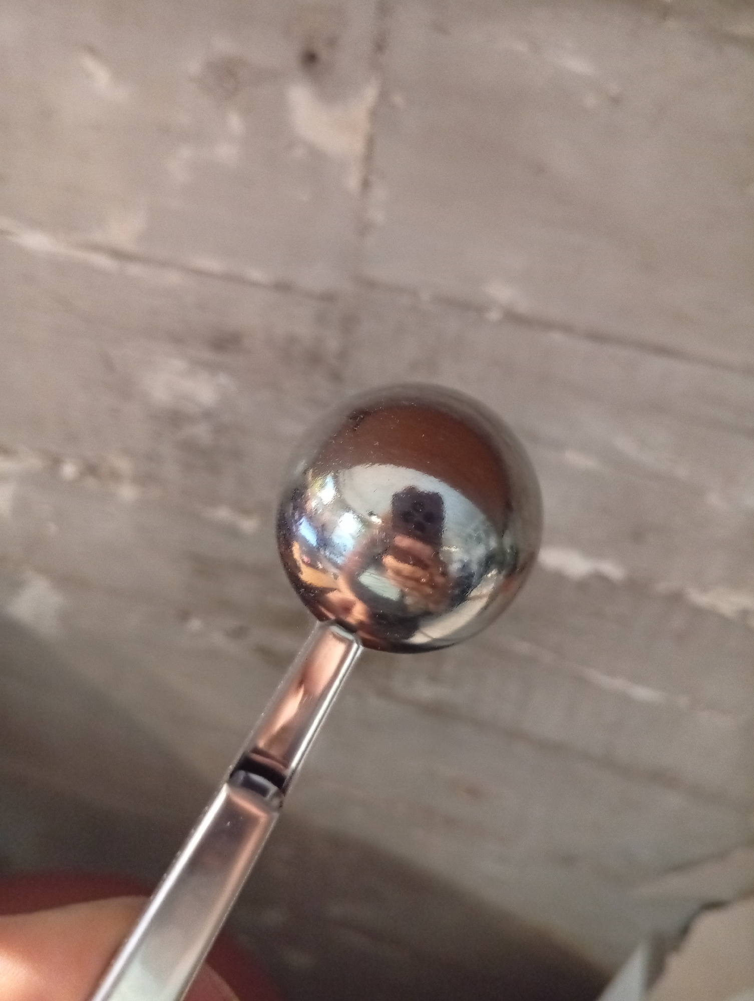 A close-up photograph shows a chrome-plated spherical object attached to a slender, square-profiled handle. The spherical object has a highly reflective surface, mirroring the surrounding environment…read more