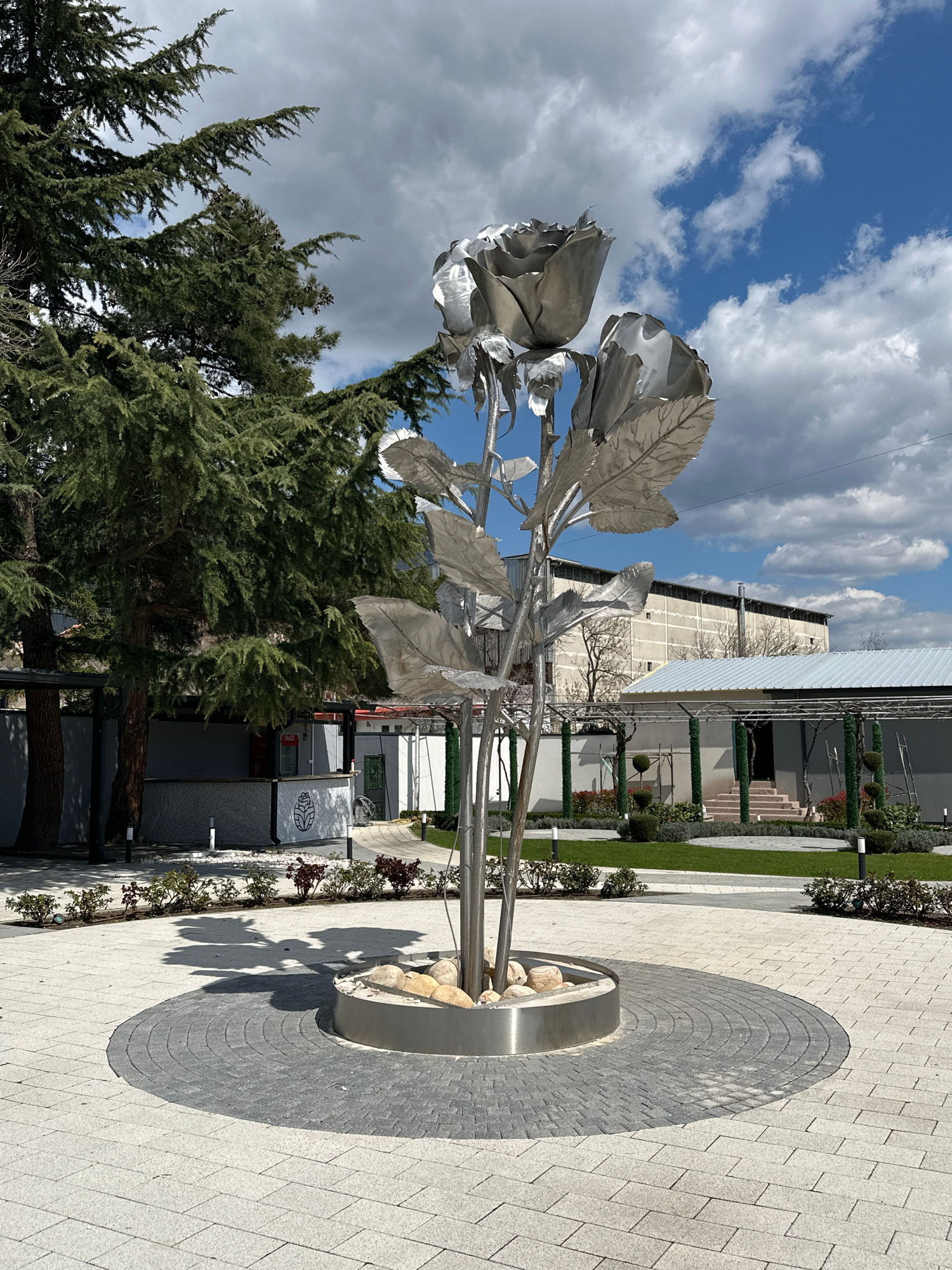 A full outdoor shot shows a silvery metal rose sculpture in Karlovo, Bulgaria, against a backdrop of green trees and a cloudy blue sky. The sculpture sits on a gray circular base filled with rocks, on…read more