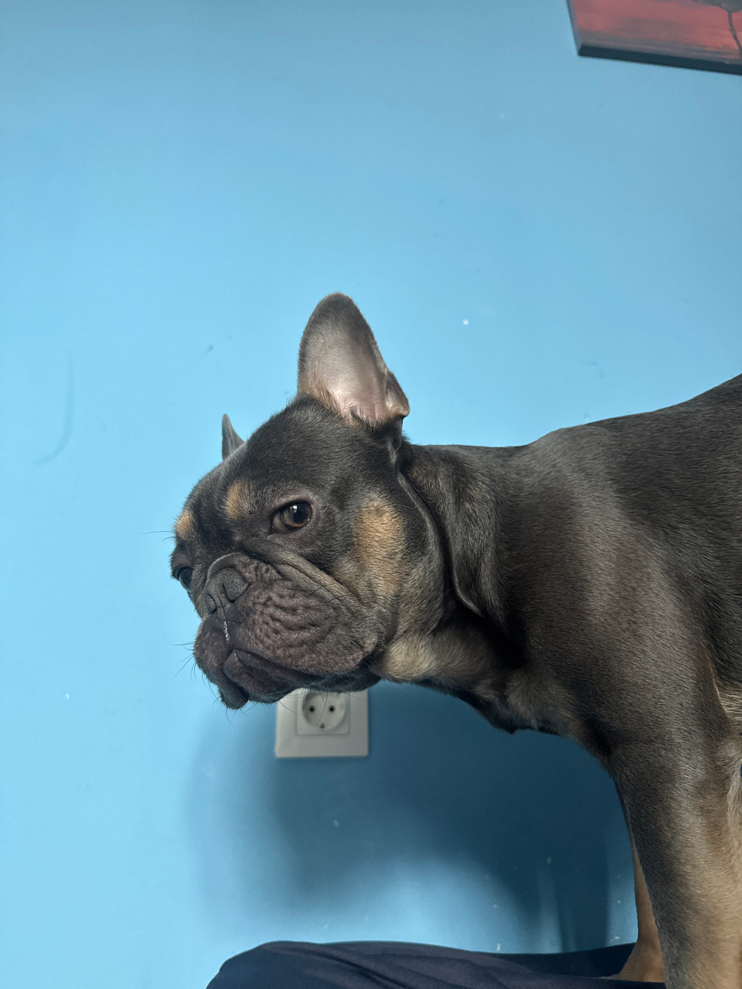 A close-up, upside-down shot features a French Bulldog against a light blue wall. An electrical outlet is visible to the right of the dog's face. A dark garment is partially visible in the right of th…read more