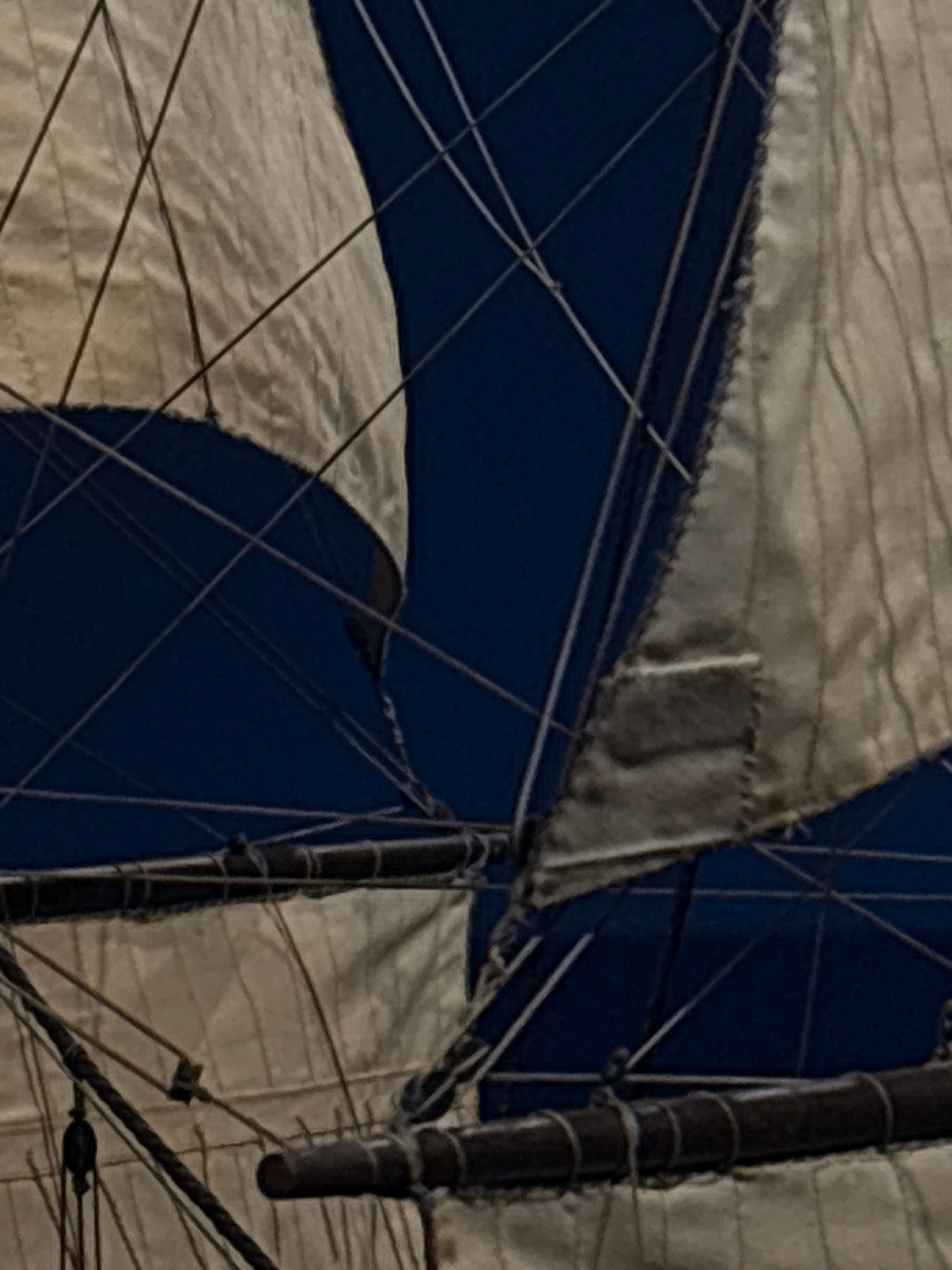 The image shows the sails and rigging of a model ship. The sails are made of white and blue fabric, and the rigging is made of thin strings. The masts are dark brown. The location is not discernible fâŚread more