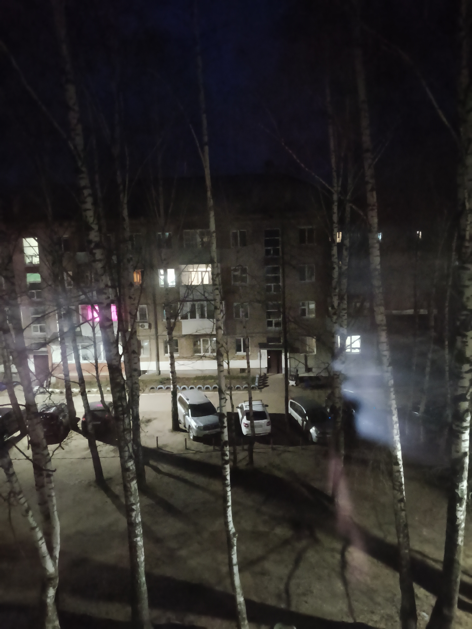 A nighttime, elevated view captures an apartment building in Chaikovsky, Russia, as seen through bare tree branches. The building, several stories high, has multiple illuminated windows. Below, three…read more