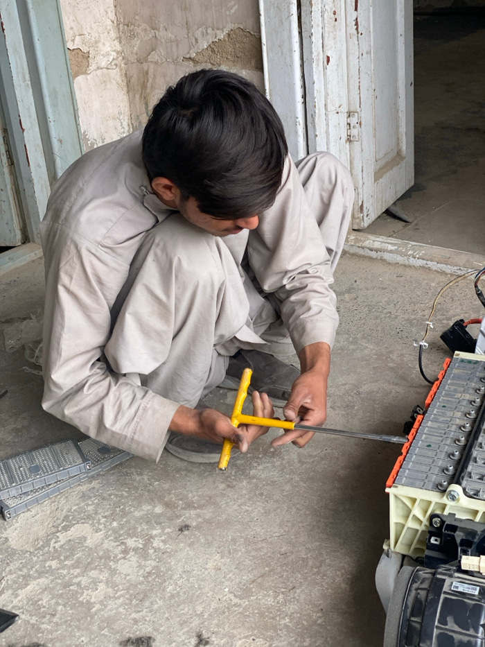 In Kandahar, Afghanistan, a young male individual, dressed in a light gray shalwar kameez, is observed squatting on a rough concrete surface. He is actively engaged in repairing or disassembling a lar…read more