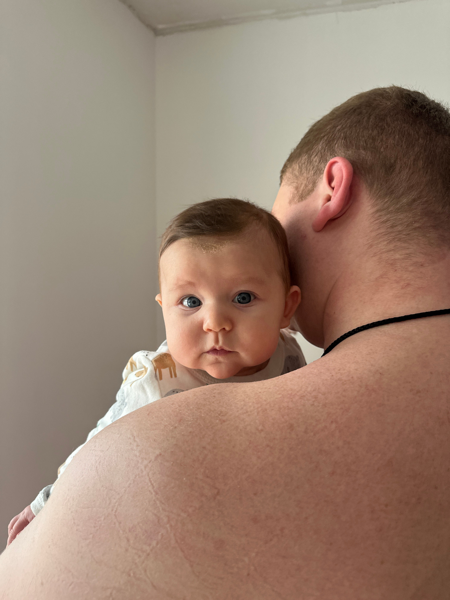 The image shows a baby with blue eyes being held. The baby is wearing a light-colored outfit with a pattern of brown animals. Behind the baby is a person with light skin, a short haircut, and a thin b…read more