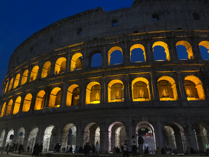 The image displays the Colosseum in Rome, Italy, during nighttime hours. The massive ancient amphitheater is partially illuminated. The second and third visible tiers of arches are brightly lit from w…read more