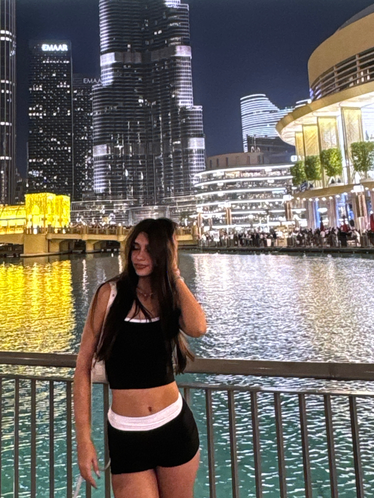 A young woman poses in front of the Dubai Fountain and Burj Khalifa in Dubai. She wears a black top and shorts with white trim, and is positioned to the right of the frame, facing slightly left. The D…read more