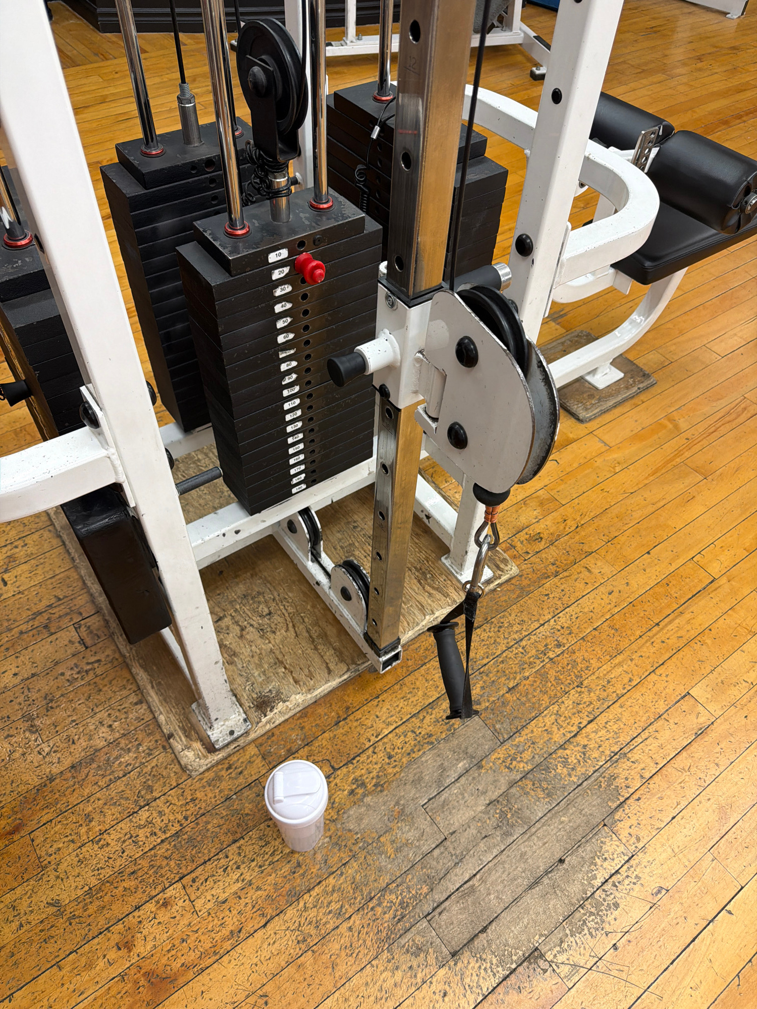 The image shows a weight machine in a room with a worn wooden floor. The machine has black weight plates and a white frame. A white plastic cup with a lid sits on the floor next to the machine. The lo…read more