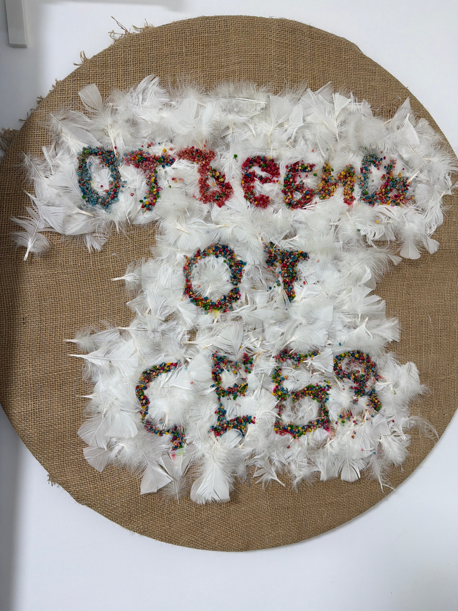A circular decorative object is affixed to a plain white wall in Ramat Gan, Israel. The object measures approximately 70-80 centimeters in diameter and is constructed from a coarse, light brown burlap…read more