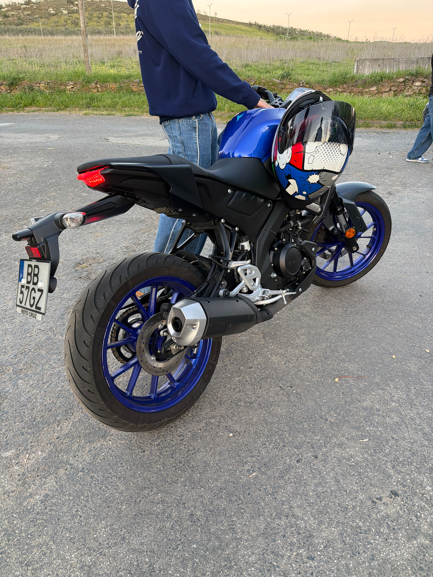 The image shows a blue and black Yamaha MT-125 motorcycle parked on a paved road in Mirandela, Portugal. A helmet with a comic-style design rests on the fuel tank. Parts of two individuals are visible…read more