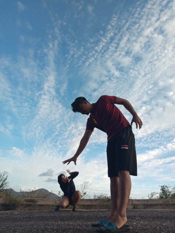 The scene is set outdoors on a dark, textured asphalt-like surface in Altagracia, Venezuela. A male subject occupies the right foreground, viewed from mid-thigh upwards. He is dressed in a dark red po…read more