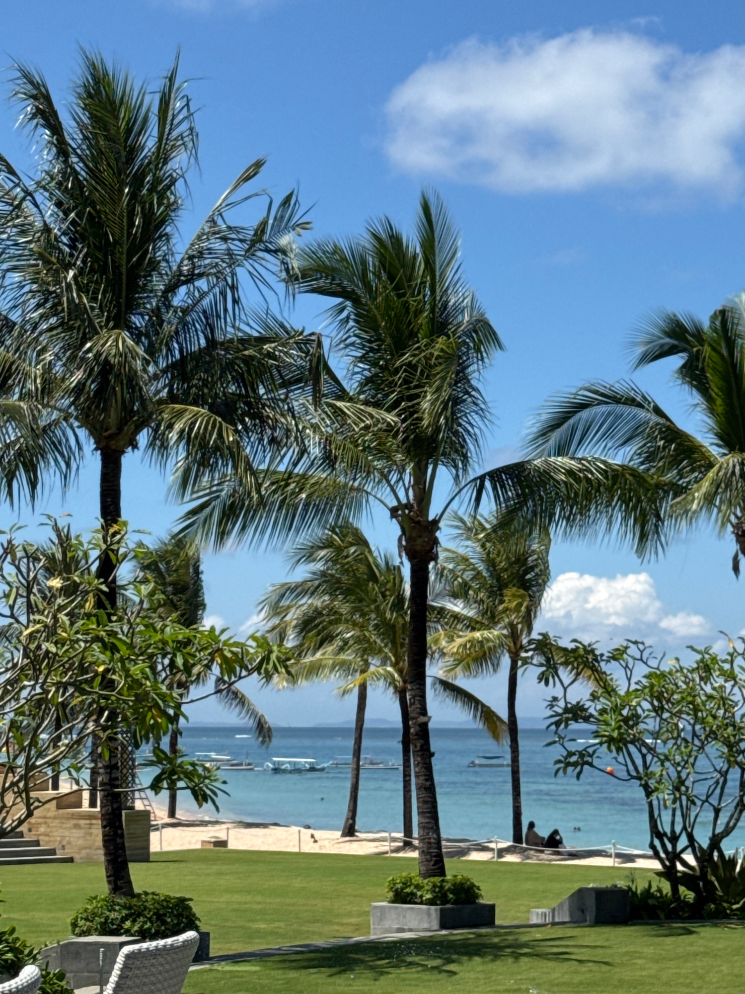 The image displays a picturesque tropical coastal scene, likely a resort in Kuta Selatan, Indonesia, under a bright blue sky with scattered white clouds. Several tall palm trees with vibrant green fro…read more