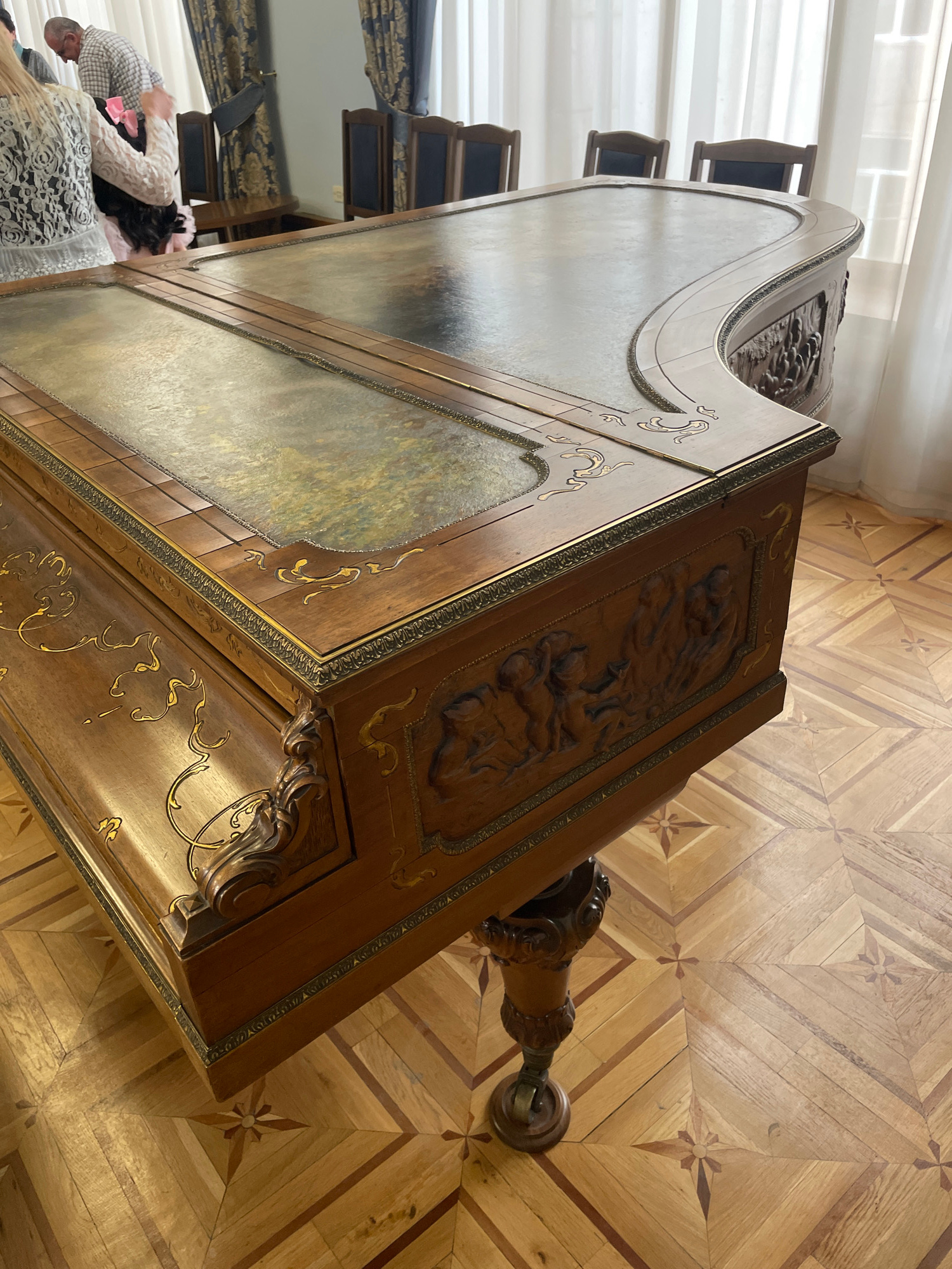 The image shows a detailed view of an ornate, antique wooden cabinet in a room with parquet flooring. The cabinet is decorated with carvings, molding, and gold accents. In the background, partly visibβ¦read more