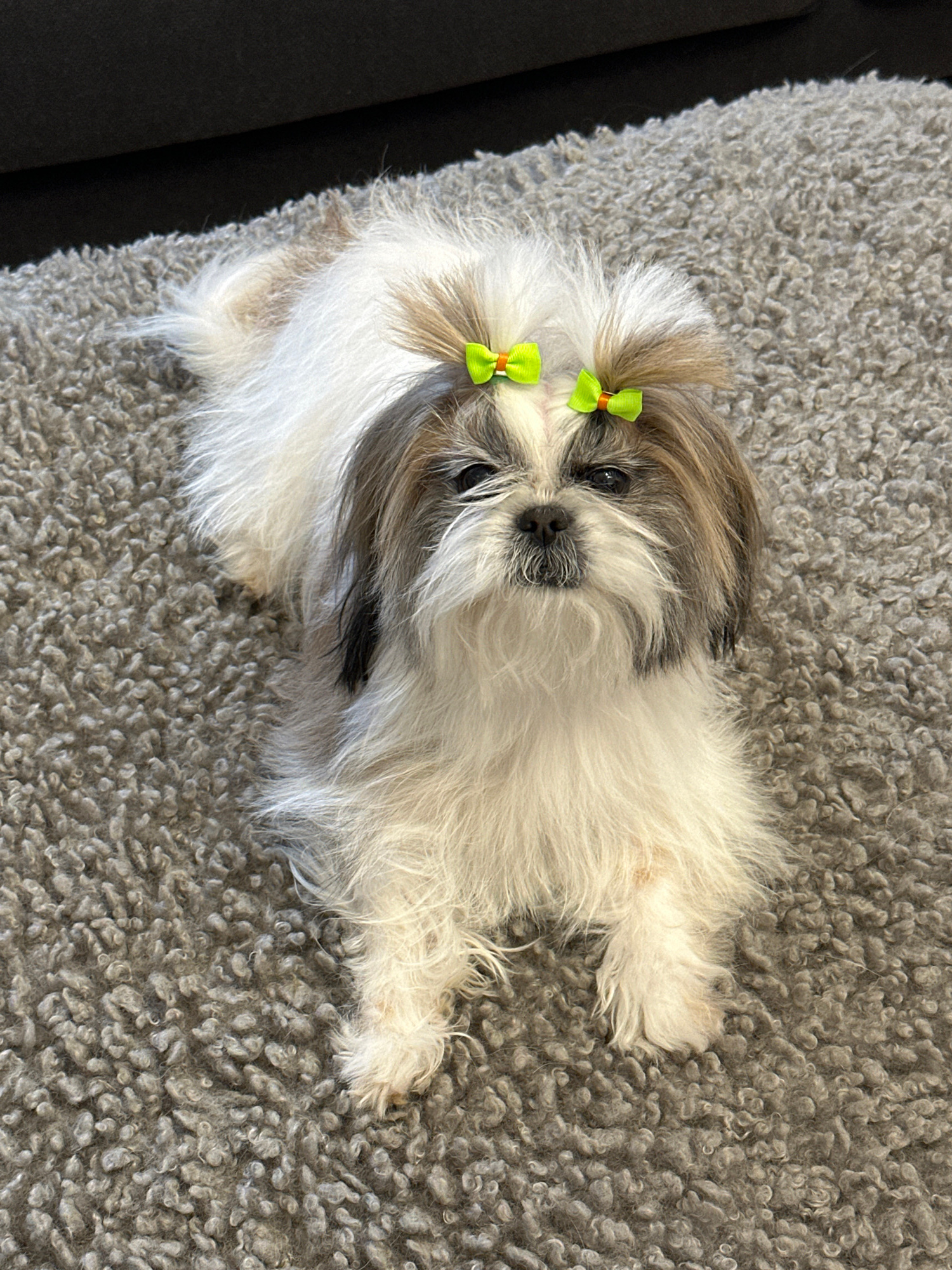 A small, long-haired dog, likely a Shih Tzu, lies on a gray shaggy rug. The dog has white and gray fur and two green ribbons tied in its hair, one on each side of its head. The dog is facing the camer…read more