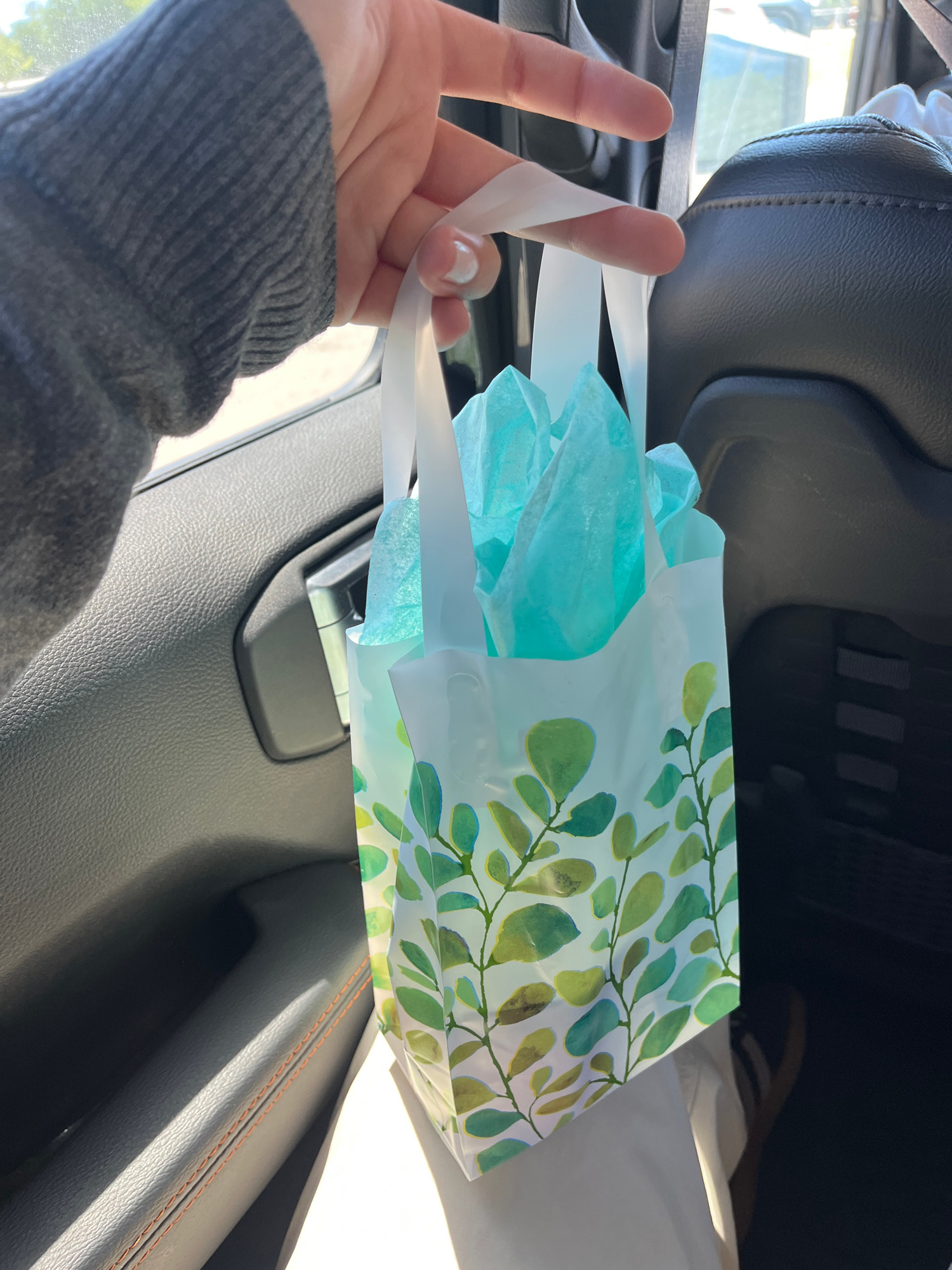 A hand holds a gift bag filled with blue tissue paper in the interior of a vehicle. The gift bag is decorated with a pattern of green leaves. The interior of the car features black leather seats withβ¦read more