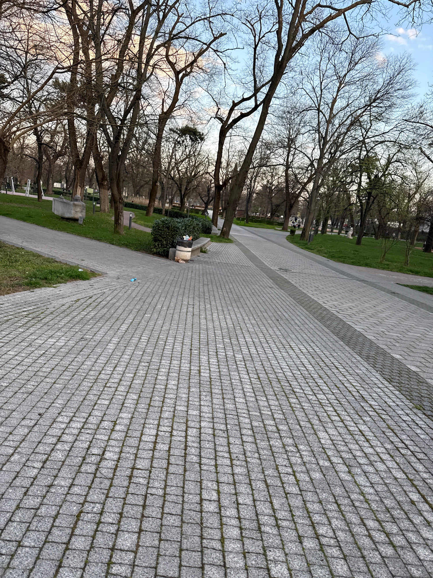 The image presents a perspective view of a public space in Stara Zagora, Bulgaria. The main feature is a wide, gray-paved walkway constructed from small, rectangular blocks. Moss can be seen growing iā¦read more