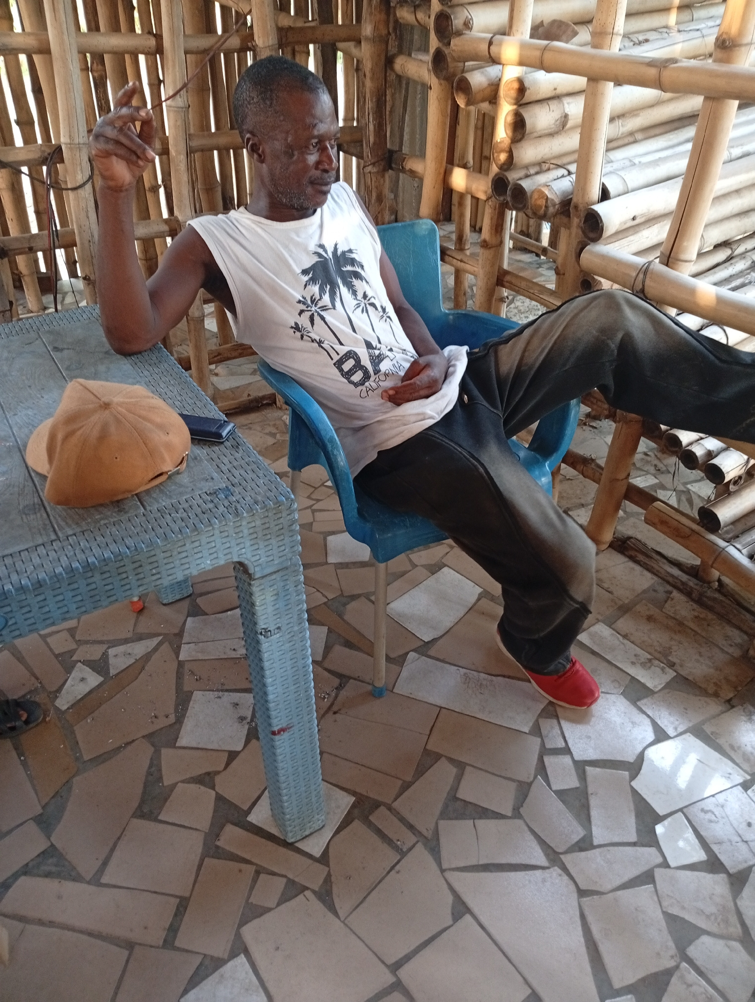 A man sits in a blue plastic chair inside a bamboo structure in Adankolo, Nigeria. The man is wearing a white tank top with a palm tree design, dark pants, and red shoes. He is seated with one leg cro…read more
