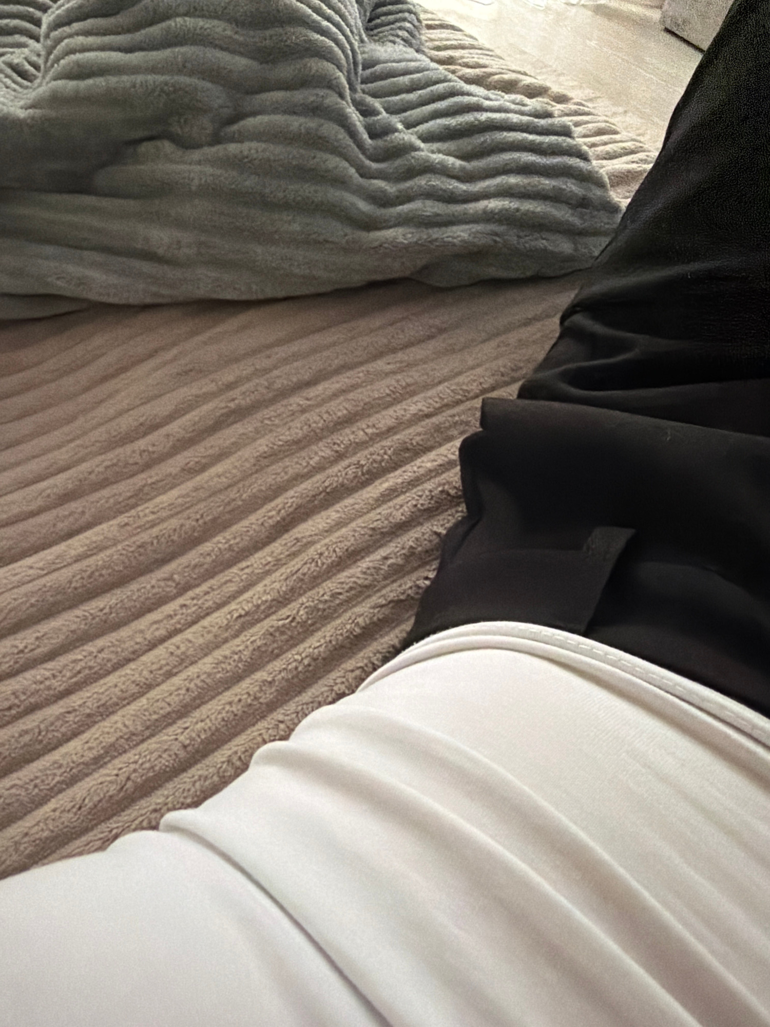 The image shows a close-up of a person sitting or lying down on a beige corduroy surface. They are wearing a black jacket or shirt with a pocket, and a white garment. A gray, textured blanket rests ne…read more