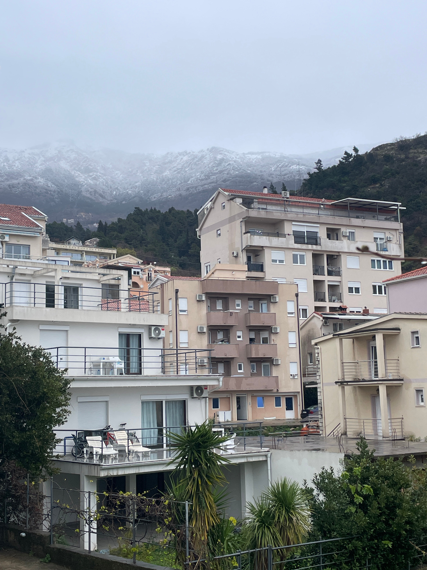 The image depicts a residential hillside area in Budva, Montenegro, under an overcast sky. In the background, snow-capped mountains are partially obscured by low-hanging clouds or mist, with their low…read more