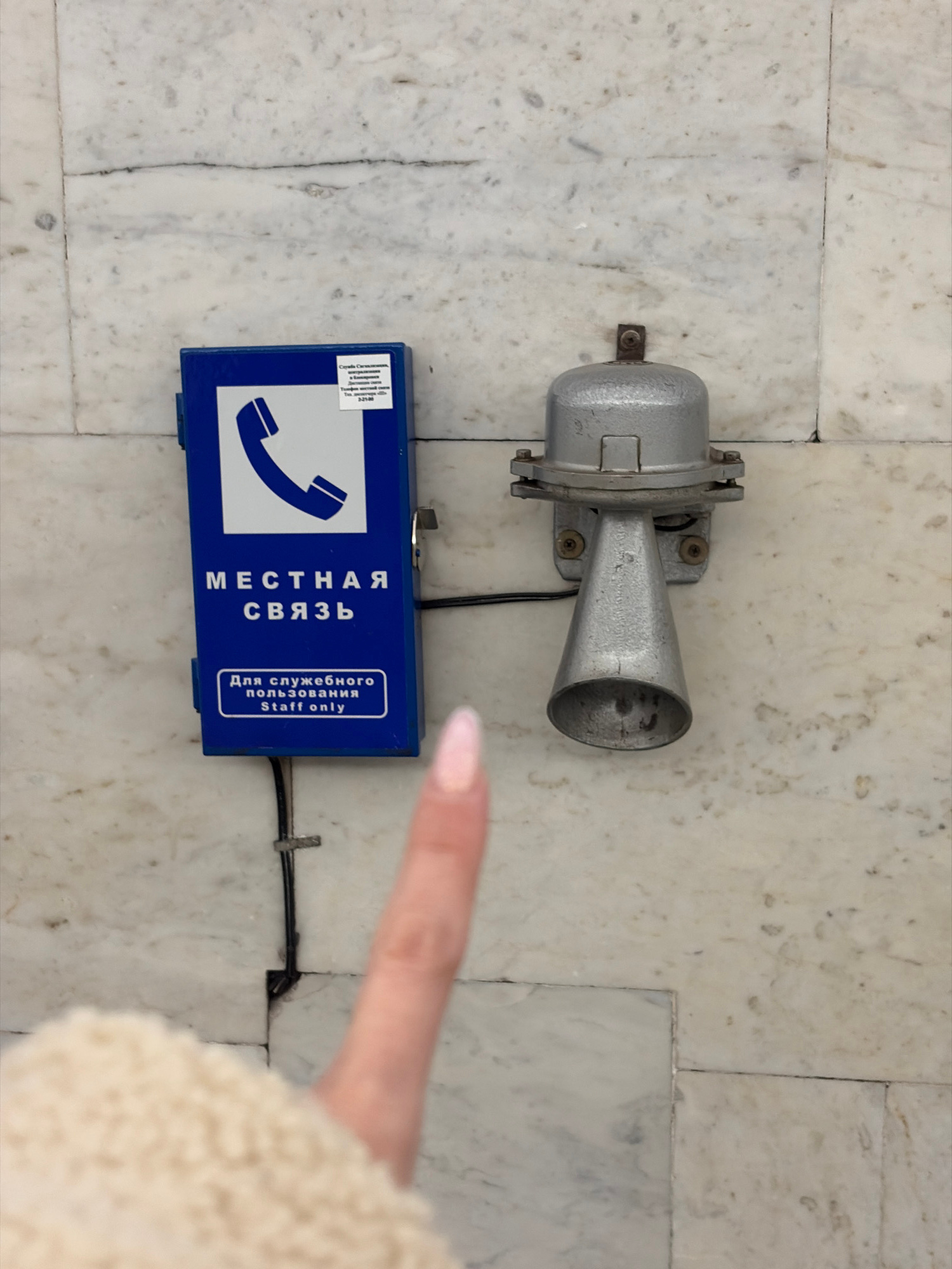 A wall-mounted phone, identified by the inscription "МЕСТНАЯ СВЯЗЬ" (Local Communication) and "Для служебного пользования. Staff only," is affixed to a marble wall. A gray horn speaker is mounted abov…read more