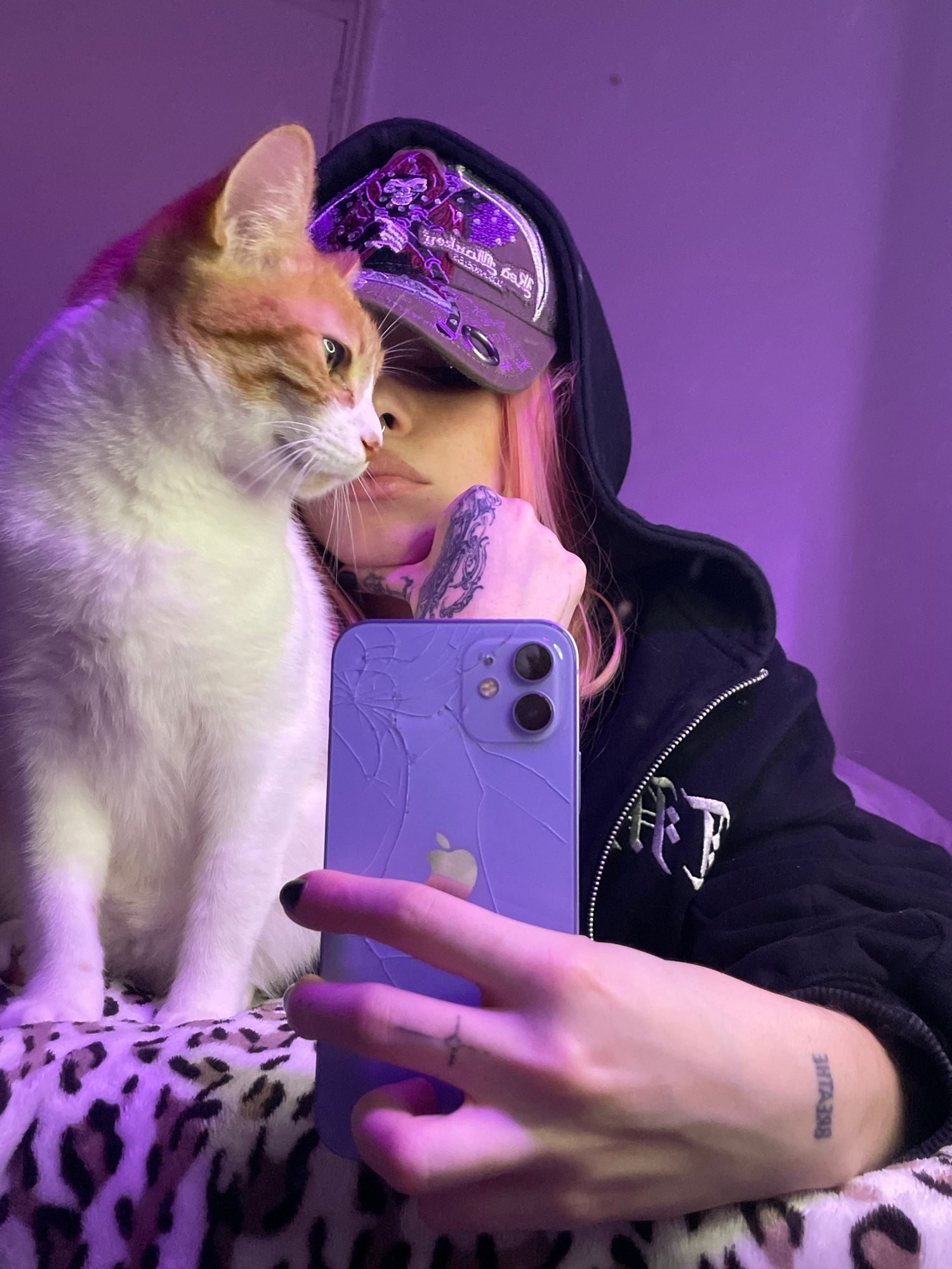 A low-angle indoor shot under purple lighting depicts a person lying down, likely on a bed given the presence of a patterned blanket. The person, who appears to be young, wears a dark hooded jacket an…read more