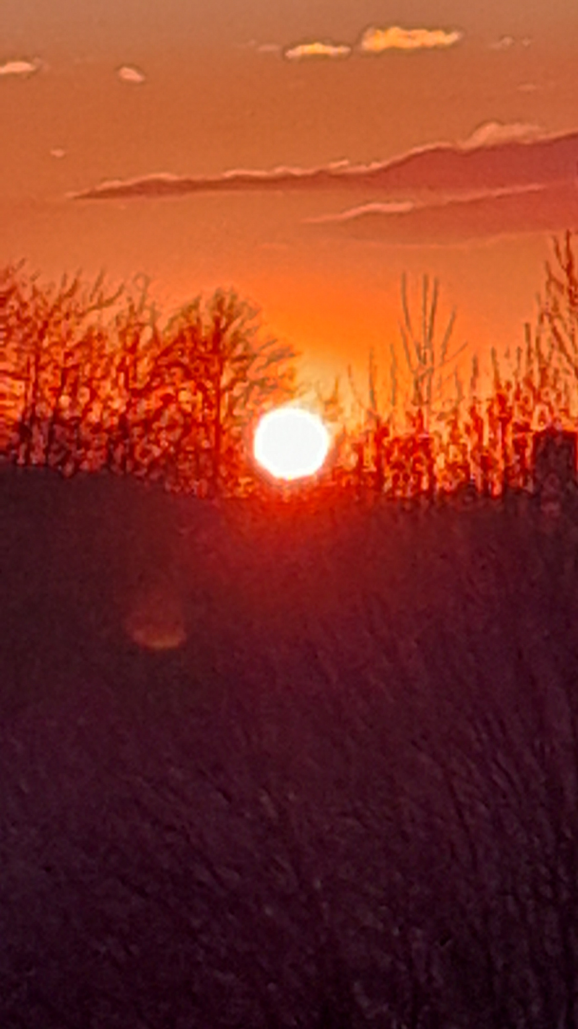 The image shows a sunset view through the branches of a tree in Saint Petersburg, Russia. The sun appears as a bright, orange-red orb. The environment is characterized by a gradient of light and shado…read more